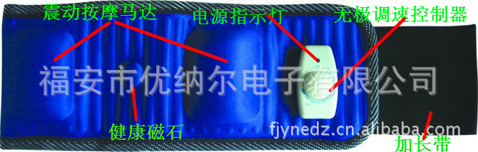 優納爾電子生產型號:YNE-323A磁療按摩腰帶旋鈕式無極調速方式;一個健康磁石;兩組按摩震動器
