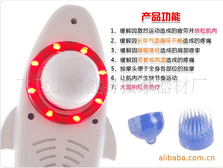 1.采用人體工程學原理而設計的錘擊振動按摩方式,人性化按摩全身各部位頭、肩、背、手臂、腰、臀部、大腿、小腿、腳部。 2.經過精心改良的按摩頭,可裝配針刺型、凸圓型按摩頭,打破瞭傳統按摩錘隻可錘擊的功能,增加瞭指壓按摩和針刺按摩功能。 3.更加人性化的觸摸式薄膜開關設計,使你操作更方便快捷。在原有的加速、減速檔設計基礎上增加瞭自動按摩程序按鈕,使你的按摩更加舒適。 4.經過大師特別設計的按摩錘,能發揮集中的按摩效果,提供輕松及有效的按摩,並且可以有效緩沖撞能力,性能強,操作方便無噪音。 5.紅外線電療:提高脂肪分解速度,改善風濕,便秘之痛楚,緩解肌肉、關節酸痛 6.人體工程學設計,輕松按摩身體任何部位,流線型的海豚外型設計,使用更加靈巧輕便,輕松好拿,方便操作。 7.外型可愛,體積輕巧,收藏方便.