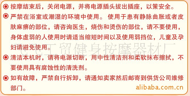 溫馨提示:按摩器連續工作時間一般為15分鐘,需要繼續按摩的請休息30分鐘後在使用,使用後請先關掉開關在拔掉電源,嚴禁直接拔掉插頭