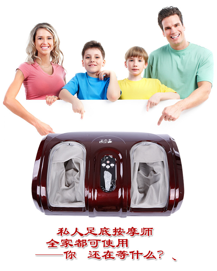 眾安康足部按摩器(足療機) 2、傳統醫學——生物全息論原理 3、經絡學———中醫經絡原理 足部按摩器(足療機) 眾安康足療機產品特點 2、雙足雙穴同步:經科研人員研制和試驗得出的結論表明,雙足雙穴足療方法比單足單穴的足療效果要高出3到5倍。 3、對癥取穴:樂天派足療機可根據個人不同身體健康狀況自主針對病理區域去選擇不同的穴位進行。 4、不受任何時間、空間的限制:眾安康足療機就像把專業足療師請到傢一樣,可以每天在沐浴後、臨睡前、觀看電視節目時休閒地“自主足療”瞭,是方便、簡易、速效的方法。 5、獨特的造型設計和穴位分佈完全吻合人體足部結構,根據人體腳部穴位的分佈,采用凹凸設計以起到最大限度的按摩足部的功能; 6、采用微電腦控制,功率隻有200W,用一次耗電僅0.1度,安全可靠,經久耐用。 7、使用簡單方便,可根據個人喜歡隨時隨地調節轉速和轉向。 眾安康足部按摩器(足療機) 眾安康足療機超值體驗 2、經濟實惠:5分錢做足療(200瓦,每天半小時,隻用5分錢電費); 3、自主足療:提高生命質量,加強自我防治疾病能力。 4、低投入、高回報:雙足雙穴同步按摩,雙通道雙力度,足療效果比人工足療高出4倍! 1、體驗傢庭足療大師:人性化的足療大師,三維立體仿生按摩法;