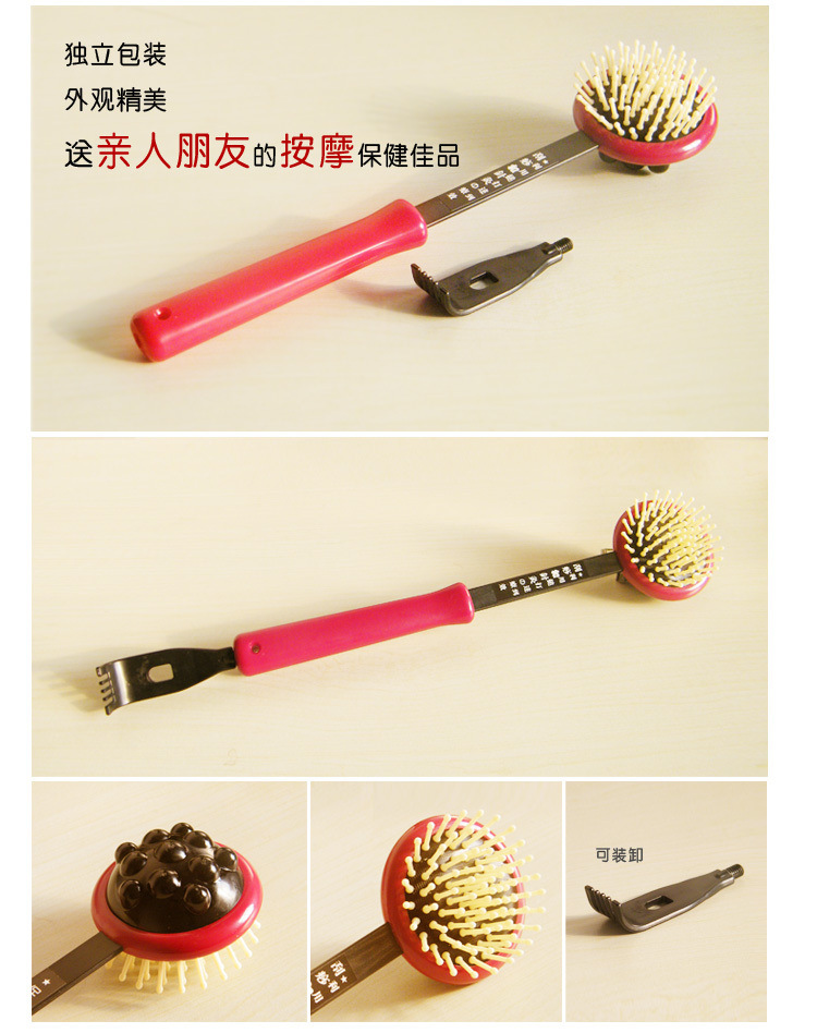 獨立包裝,外觀精美,送親人朋友的安摩保健佳品. ※可以對頭部、手、腳進行按摩和梳理,促進血液循環,也可對腰、腿、後背進行敲擊,起到按摩的作用。後面加上一個不求人,按摩的時候還可以順手撓撓癢。