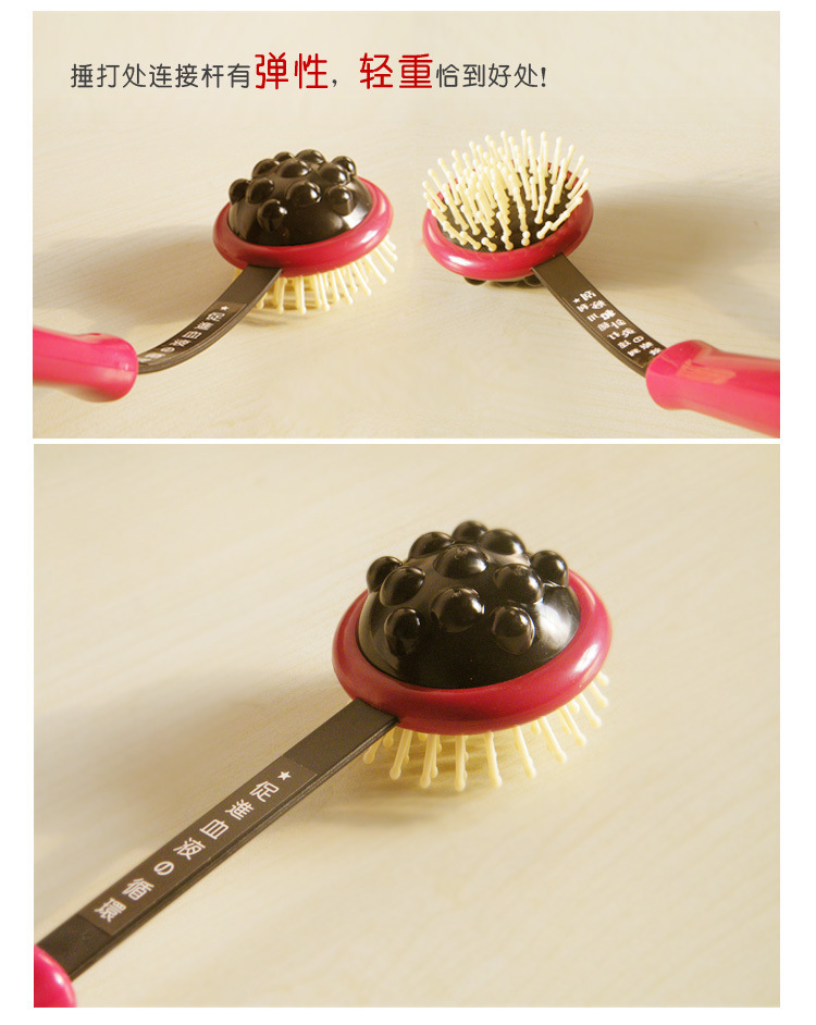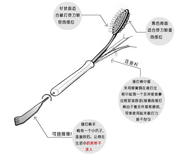 一頭可敲擊捶打全身(頸部、肩部、手部、腳底等),能起到刮痧和針灸的功效。另一頭可撓癢癢!可裝卸。捶打處連接桿有彈性,輕重恰到好處