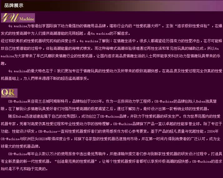 4u machine為香港創享國際旗下動力最強勁的情趣用品品牌,堪稱行業內的“性愛機器大師”。主張“追求極致性愛體驗”,在爆發式的性愛高潮中為人們提供高潮潛能的無限超越,是4u machine的不懈追求。