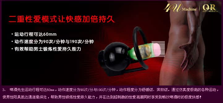 3、 啤酒先生運動行程可達60mm,動作速度分為90次/分與190次/分鐘,動作程度分為舒緩級、奔放級。通過仿真度極高的各種運動,使男性陽具抵達通道最深處,幫助男性鍛煉性愛持久能力,並在達到超刺激的性愛高潮同時享受到暢飲啤酒時的極度快感!
