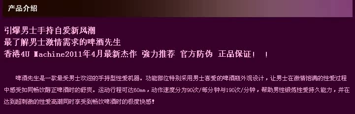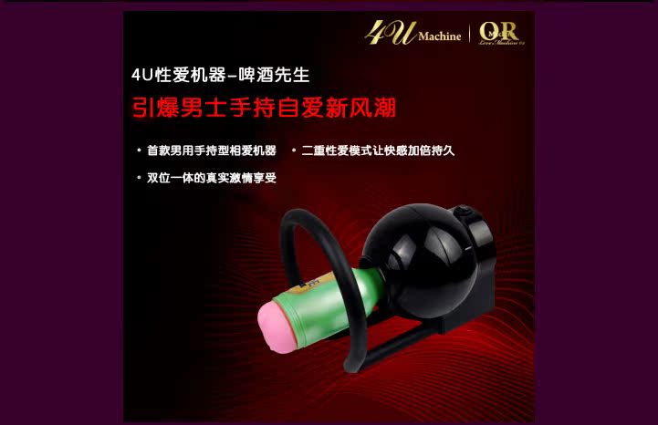 1、 首款男用手持型性愛機器,啤酒先生功能部分特別採用男士喜愛的啤酒瓶外觀設計,讓男士在激情飽滿的性愛過程中感受如同暢飲醇正啤酒時的舒爽。