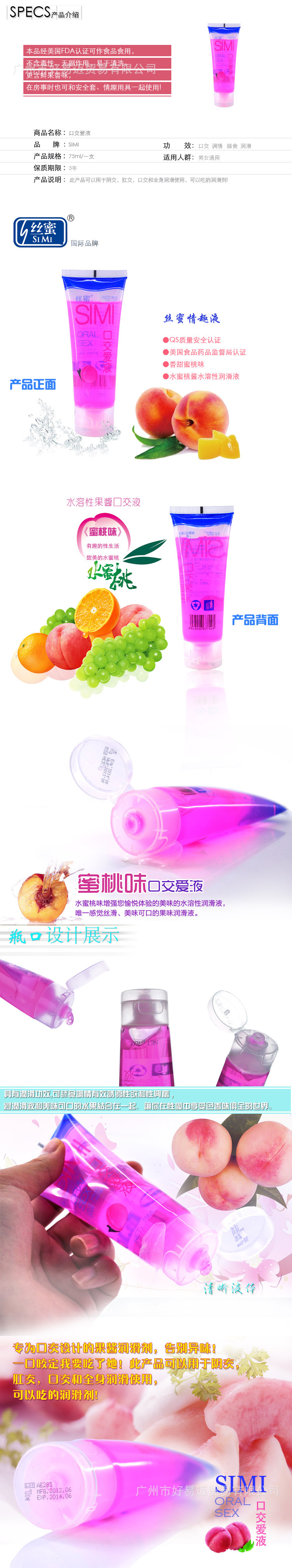 Simi口交情趣液是一款鮮嫩欲滴的美味ai液,嚴格按照國傢食品與藥物管理局的準則進行生產,安全衛生.與女性自然分泌的ai液類似,獨特的鮮嫩果味讓您在激情洋溢,熱血沸騰的口交舔食時忍不住吃下也無所謂,絲滑感覺,芬芳怡人,吸允更有情調.