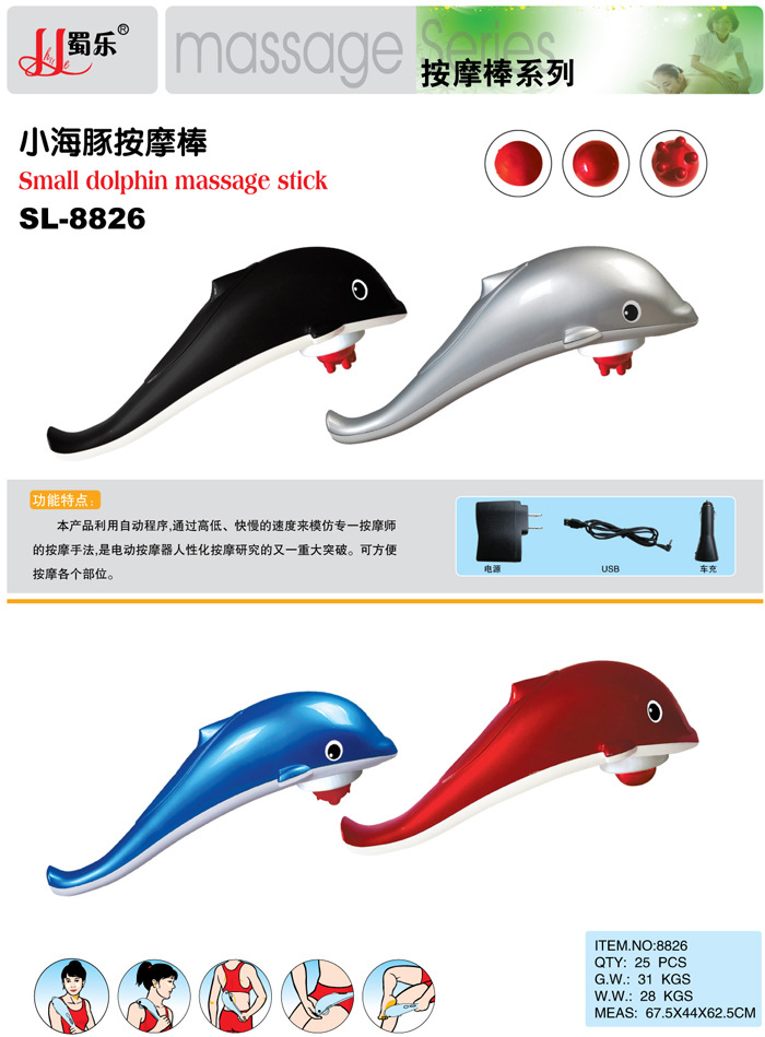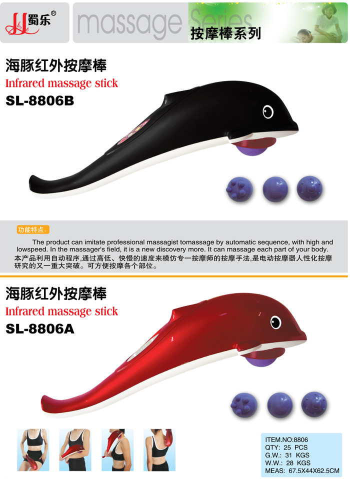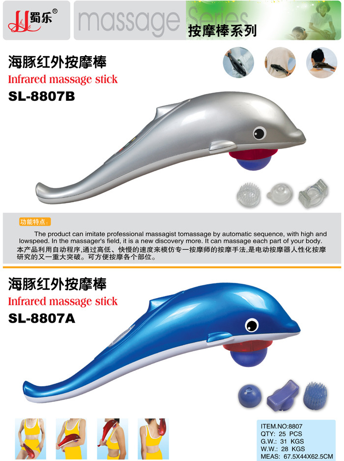 海豚按摩器是一種便攜式的強力、高速按摩器,其特點為大面積紅外線電療,可消除疲勞,促進血液循環,緩解肌肉酸痛,增強免疫功能。本產品包裝精美,檔次高,有中文包裝和英文包裝兩種選擇。是饋贈親朋好友,居傢旅行的必備之品。
