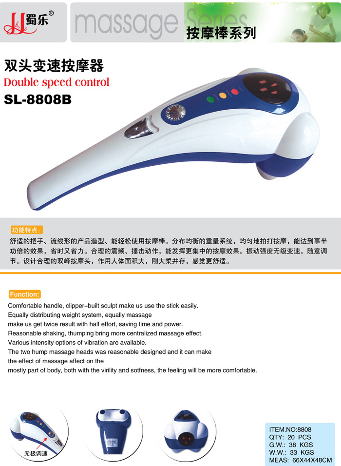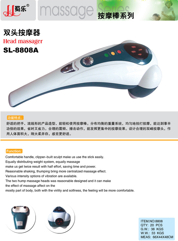 2.經過精心改良的按摩頭,可裝配針刺型、凸圓型按摩頭,打破瞭傳統按摩錘隻可錘擊的功能,增加瞭指壓按摩和針刺按摩功能。