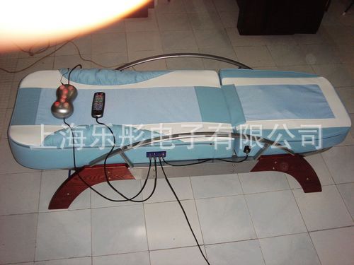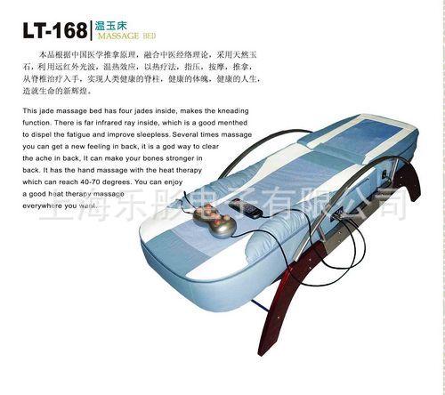本品床墊中置有兩組八隻天然玉石材料磨制的玉球,在微電腦控制下,按設計程序沿脊柱上下滾動,對脊椎彎曲、關節功能紊亂等狀況進行矯正,對脊神經進行疏理,以糾正神經功能異常,維護神經正常傳導。神經功能的正常化能夠增強內臟器官及四肢組織的活力,以此治療多種慢性病癥。