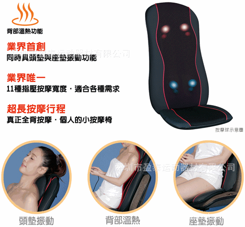 3.背部內置4個柔性按摩球,呈對稱式分佈,可從背部、腰部上下行走揉捏按摩(或定按摩)。