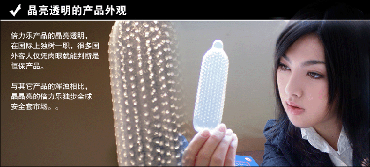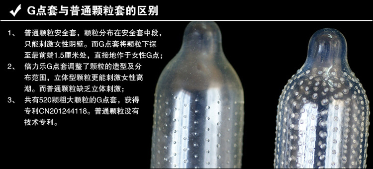 技術背景: 在安全套的外壁上設置顆粒狀凸起的男用安全套一般稱之為顆粒安全套或浮點安全套。浮點安全套是通過其外壁上的顆粒狀凸起增加肌膚摩擦系數,以增強對女性的刺激作用。 G點是指位於女性陰道下1/3、靠近恥骨的陰道前壁的一塊區域;經由性刺激,這塊區域產生突起反應,女性也因此達到高潮。G是“葛”醫師名字的第一個字母,為紀念他的發現,於是以此命名。G點理論已獲得性學領域廣泛認同,並的得到無數人群親身確認。 倍力樂G點套通過技術創新,以特殊構造提升對女性G點的重點刺激效果,幫助女性提前獲得性高潮,有效延長高潮延續時間。
