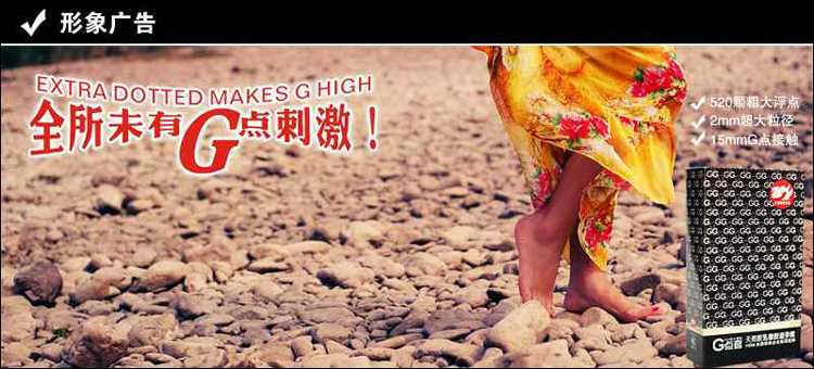 產品構造:G點安全套包括儲精囊和套身,在套身的外壁上,從儲精囊後端起15mm處開始,至套根部向前40mm處之間,特殊點狀環形均勻排列520顆顆粒狀凸起。凸起顆粒粒徑1.8MM;