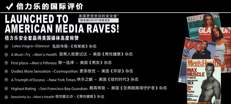 社會意義:大顆粒G點安全套秉承倍力樂人性化科技傳統,從女性消費者需求出發,女性也可以主動快樂地享受“性福”,顛覆瞭安全套歷史上產品功能研發以男性為中心的傳統;G點套與倍力樂女用安全套,倍力樂水溶性安全套三款產品獨樹一幟,開創“女性安全套”新紀元。 作為倍力樂眾多特種安全套產品線中的一員,推薦安全套產品由單純功能性(避孕、預防防性病、艾滋病等),向人性化、娛樂化轉變;打破瞭全球安全套同質化、沒有創新產品的怪圈,為成人行業帶來勃勃生機;