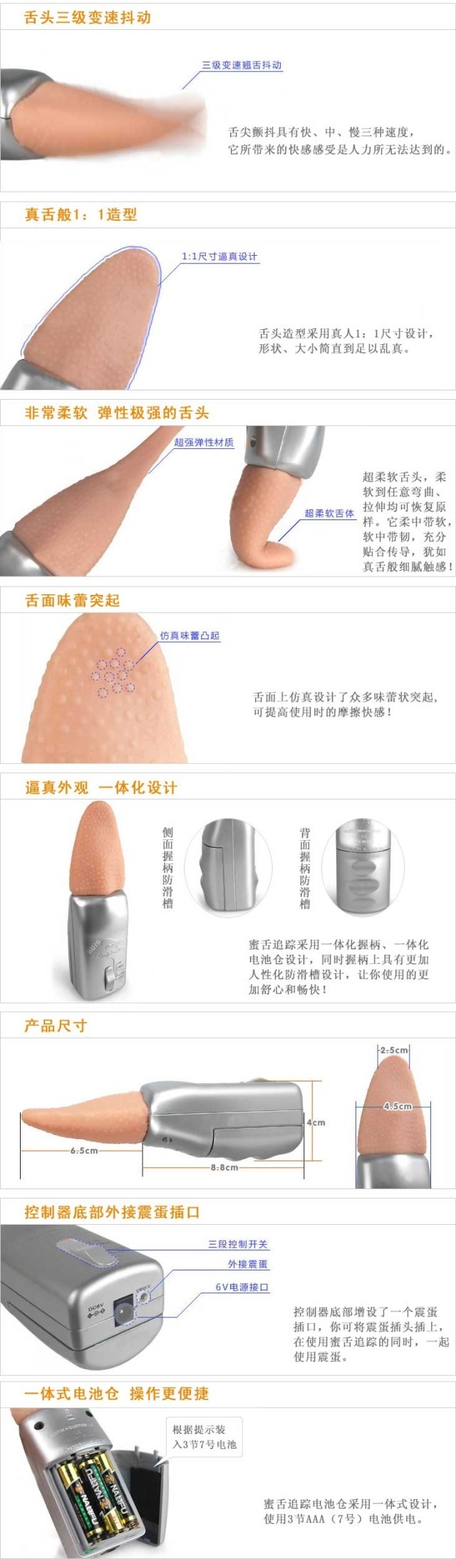 最新出品,針對女性外陰(或者其它敏感部位)進行按摩的體外振動器。1:1真舌般的造型,性感、柔軟、彈性十足,帶給你真人也無法達到的極限舌顫。舌頭采用有機矽樹脂制成,柔軟到可以任意彎曲。舌面上佈滿瞭味蕾狀突起,可提高使用時的摩擦快感。3級變速抖動,一體化握柄設計,還可外接震蛋使用,絕對給你帶來從未有過的快樂體驗。