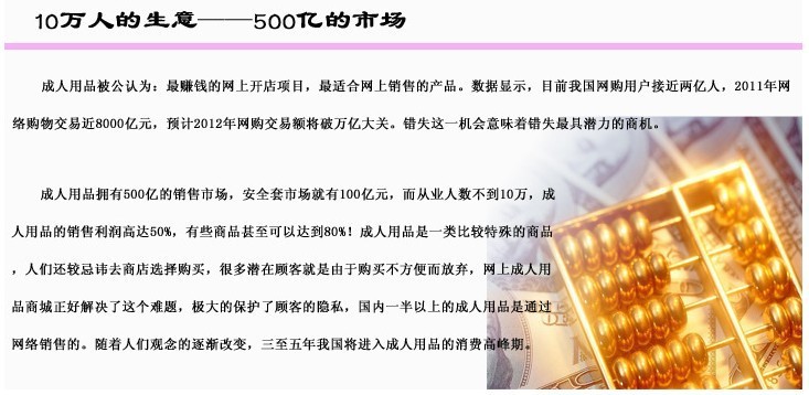 成人用品行業每年網絡購物增長迅速:成人用品市場每年5千億左右,對創業者而言,開一傢網店投資較少,操作簡單,成本回收快。