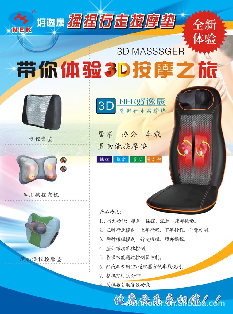 ★超薄型設計,厚度僅為7cm;獨創圓弧對稱式按摩;可按頸、背、腰從最上端連續按摩至最下端;指壓及圓弧揉捏手法,可消除疲勞;體積小巧,輕便;汽車、辦公室及傢庭皆可用,可配合傢裡沙發和辦公椅使用。
