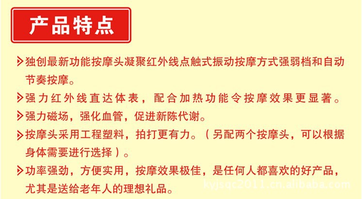 新穎的紅外線發熱設計,讓您在按摩的同時可以進行熱療,對受寒受涼導致的疾病有很好的效果。