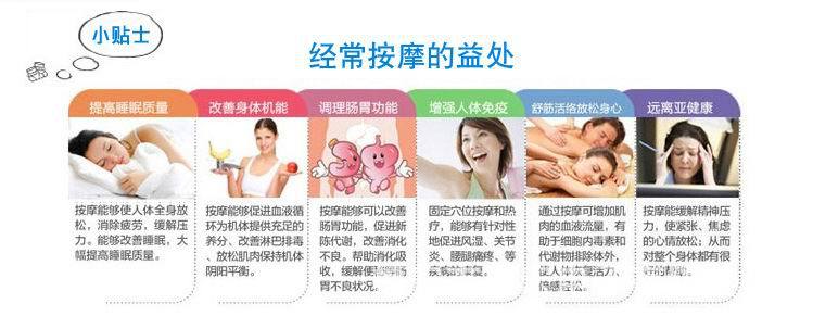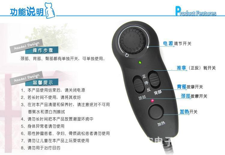 ★舒體養身機是融合傳統經絡按摩與現代醫學按摩原理及人體工程學原理而研制成功的按摩保健產品。 ★舒體養身機采用高級進口質地細膩PU面料及增強網佈。 ★頸部兩個內置熱灸按摩球,可以根據人體高度調節到合適位置進行按摩,正轉、反轉隨心變換。 ★背部、腰部內置有四個不同高低深度熱灸按摩球,正轉、反轉隨心變換。 ★裝置溫熱熱灸功能:讓您可以享受到溫熱帶來的溫暖舒適。 ★ 裝置溫熱熱灸功能:讓您可以享受到溫熱帶來的溫暖舒適。 ★ 七彩變色紅外裝置:美觀大方。 ★機內設置自動感應器,在調速已達到極限時,若還不滿足於您的身體需要增加力度,隻要身體倚靠按摩墊,自動感應器可根據您的身體的壓力而增加力度。★ 翹翹板式按摩結構設計,可隨脊椎“弓”狀形自動調節。 ★無極按摩速度選擇以便在您使用時保持極佳按摩性能。 ★裝置過熱自動保護器和整機保險管設計,雙重保護,安全可靠。 |