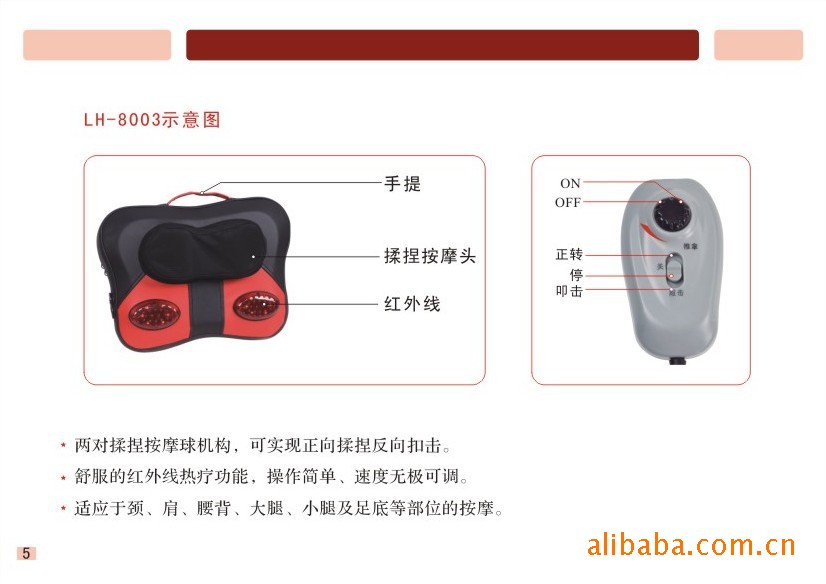 5.舒適有效的揉捏按摩功能可促進軟組織血液循環,解除疲勞,消除酸痛,改善血液循環,促進新陳代謝,疏通經絡.暢通氣血,振奮精神,讓您保持旺盛的精力。