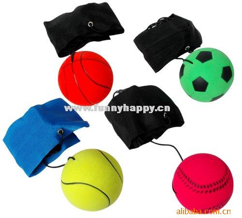 擁有彈力,安全玩具; 玩法1:可以將手腕帶系在手腕上,將球向前方地面拋出以同一手或另一手擊回; 玩法2:向背後扔出轉身,同手或另一手接回; 玩法3:可向下方地面擊打,球跳向上方後下落另一手接回; 均應用松緊繩的回力效果,使球可以在你周圍范圍內被你接住,健身,看是誰接住的次數最多。
