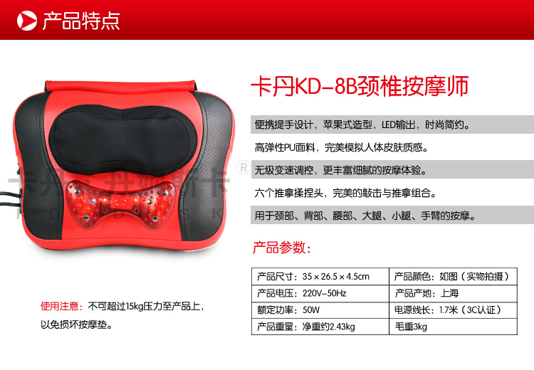 卡丹KD8系列腰頸椎按摩師是融合傳統經絡按摩現代醫學按摩原理,最新研制成功的保健產品。它具備推拿及叩擊功能,能有效代替人工按摩,舒展全身緊張的筋骨和肌肉,減輕人體的緊張和壓迫感,使全身舒暢無比,更能促進全身的血液循環,加快新陳代謝,從而達到防病保健強身之效。同時,其獨特的無極凋速線控及精巧的外觀設計,讓使用者享受更合理的按摩樂趣,是傢居旅行、饋贈親友的保健佳品。