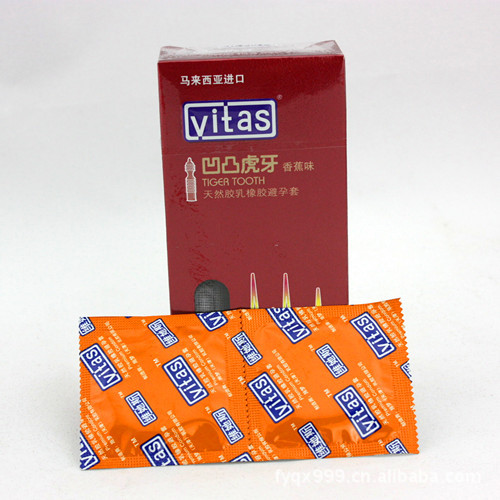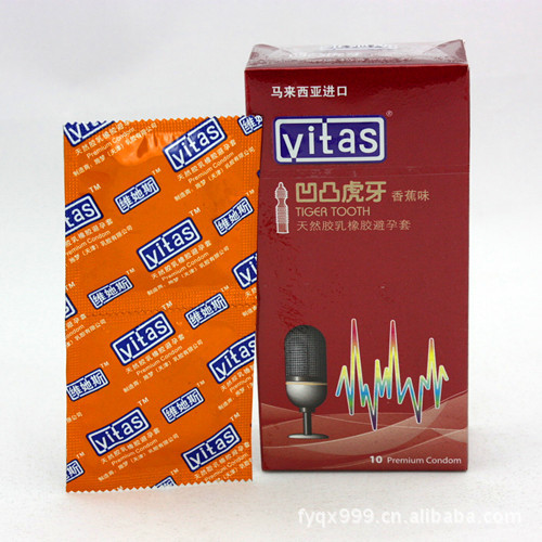 凹凸虎牙 全加長尖狀顆粒設計並添加多量潤滑劑,像虎牙一樣的超長顆 粒形狀必將增強您的刺激程度。該產品為無色透明,香蕉味。 latex with constrictive design and long sharp granule surface and abundant lubricant; the super long granules like tiger tooth will give the user violent sexual enjoyment. The product is colorless and transparent in banana aroma |