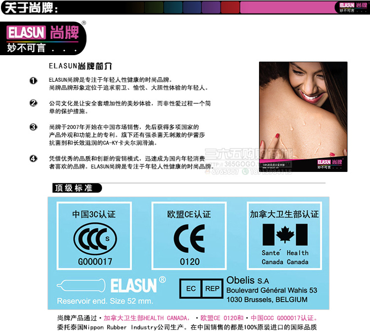 ELASUN尚牌是專註於年輕人性健康的時尚品牌。尚牌品牌形象定位於追求前衛、愉悅、大膽性體驗的年輕人。公司文化是讓安全套增加性的美妙體驗,而非性愛過程一個簡單的保護措施。尚牌於2007年開始在中國市場銷售,先後獲得多項國傢的產品外觀和功能上的專利。憑借優秀的品質和創新的營銷模式,迅速成為國內年輕消費者喜歡的品牌。