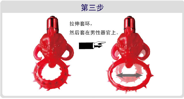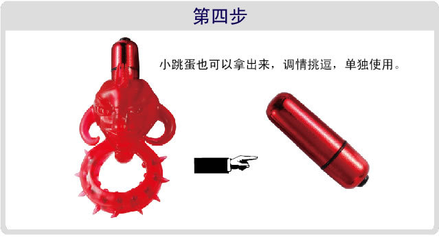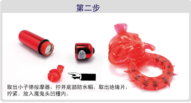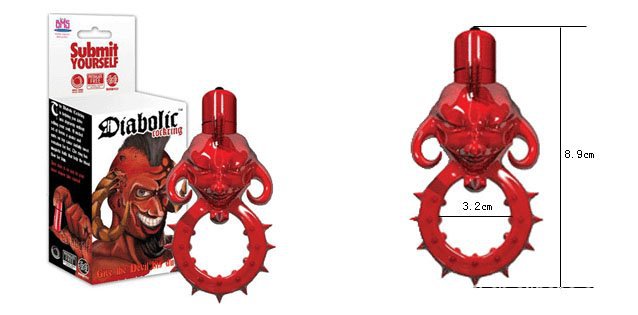 魔鬼頭鋼珠振動環,魔鬼的頭部長有一對邪惡的角、頂部是一束類似山羊的胡須,使用時可以給她帶來別樣的刺激。下面的矽膠環佈滿一圈結點和刺須,環內部還分佈著魔力磁性球,使用時隻需輕輕滑動該矽膠環便可使他熱血奔騰。本品還配備一個可移動的三速防水按摩器,即可以配合魔鬼頭部使用,也可以當作震蛋單獨使用,推動按摩器滑進魔鬼頭部,開啟震動,魔鬼的舌頭和角便開始震顫,以此獲得振動的樂趣。按摩器分三種頻率,分別為低速、中速、高速震動。