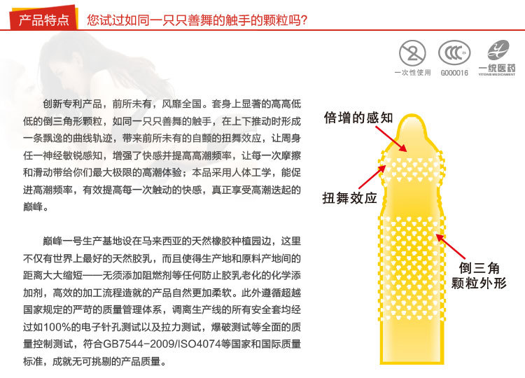 本品能夠安全有效避孕。在正確使用方式下,可降低感染艾滋病和其他性病的機會。例如衣原體、生殖道皰疹、淋病、梅毒等。使用時無任何異物感,能最充分的激發快感!