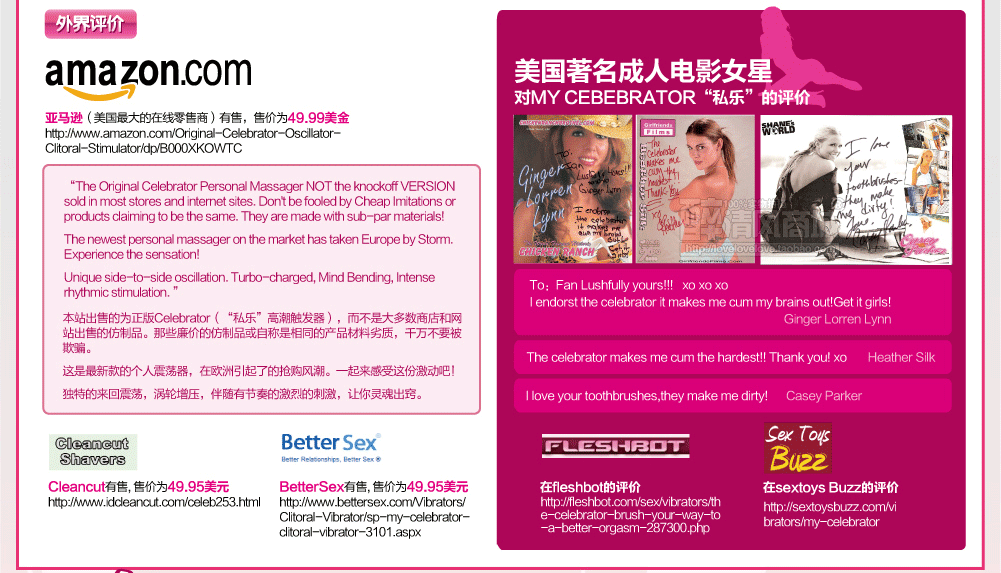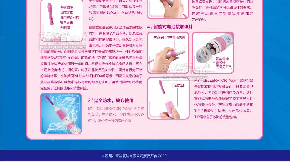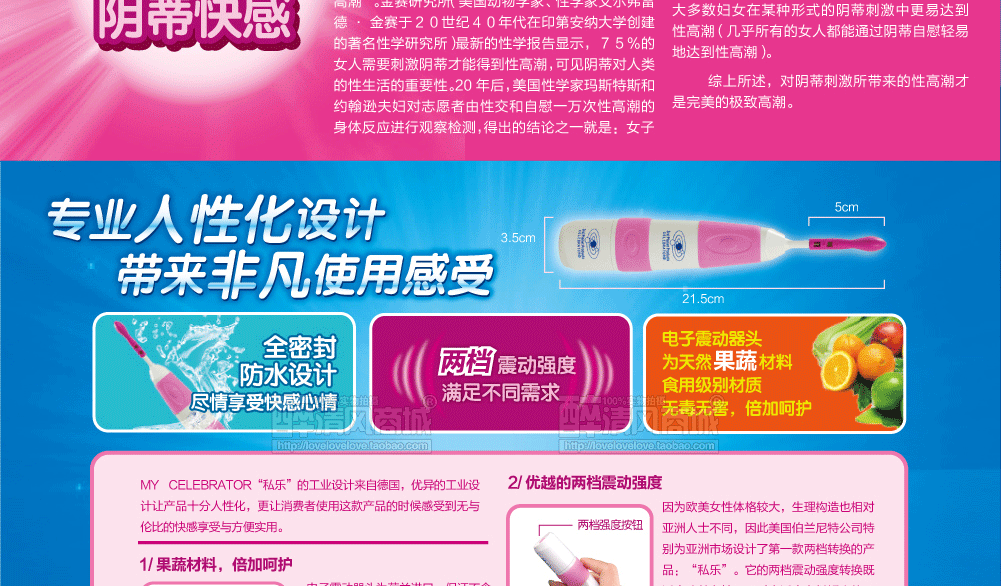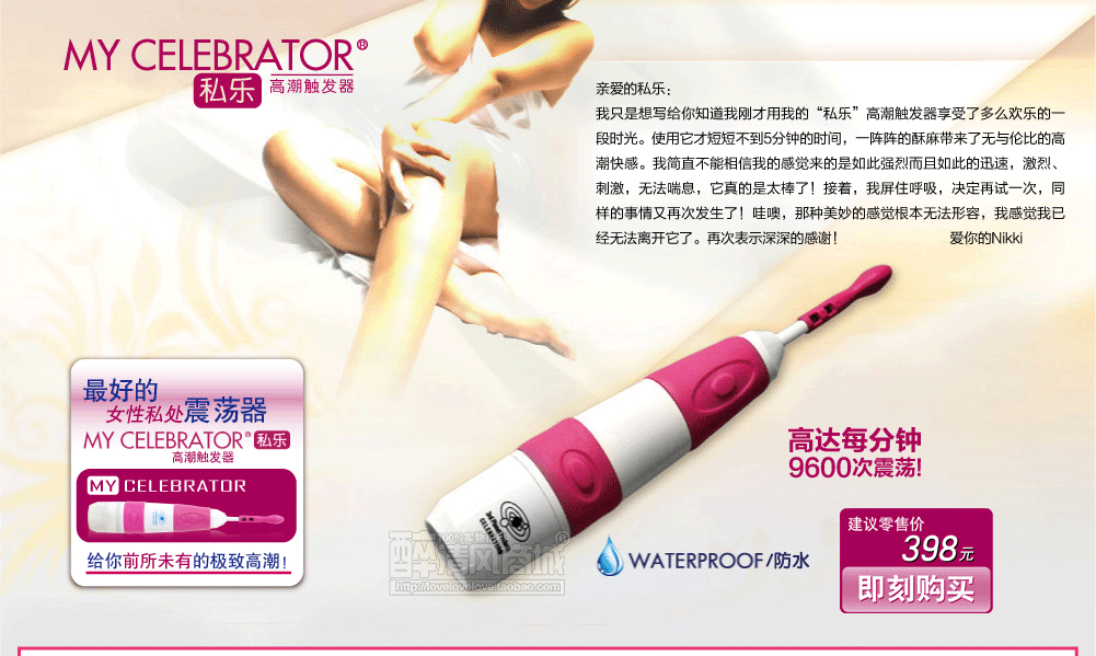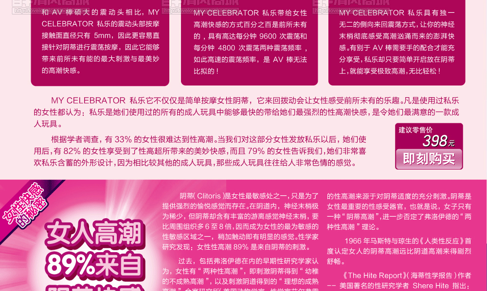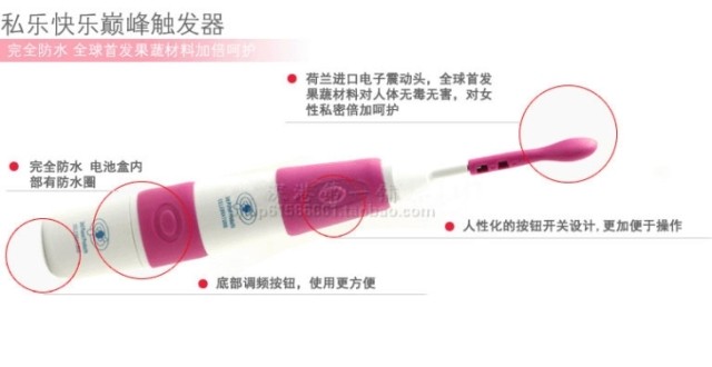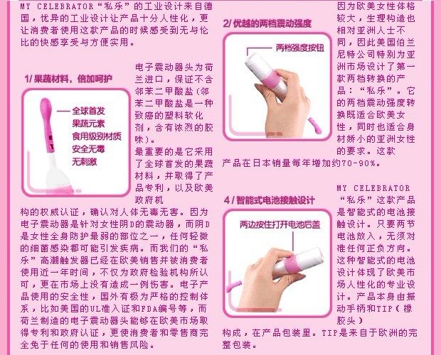 電子震動器是針對女性陰蒂的震動器,而陰蒂是女性全身防護最弱的部位之一,任何輕微的細菌感染都可能引發疾病。而我們的“私樂”高潮觸發器已經在歐美銷售並被消費者使用近一年時間,不僅為政府檢驗機構所認可,更在市場上沒有造成一例傷害。