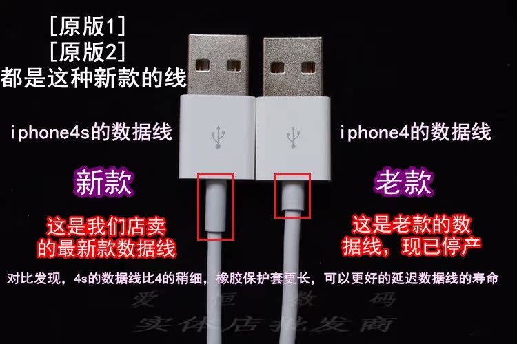 和老款數據線(iphone4,ipad1/2)區別是線細一點,接口處的橡膠更長一些,更好的保護線材,經過仔細對比發現新款數據線有2個版本,都是原裝的。如圖下,主要區別就是[原版1]的USB合縫處比[原版2]粗,[原版1]的線比[原版2]的線長大概3CM左右,[原版1]的英文字母在連手機端,[原版2]的英文字母在USB口端,[原版1]的數據線端口裡沒小柵欄,[原版2]裡面有小柵欄。