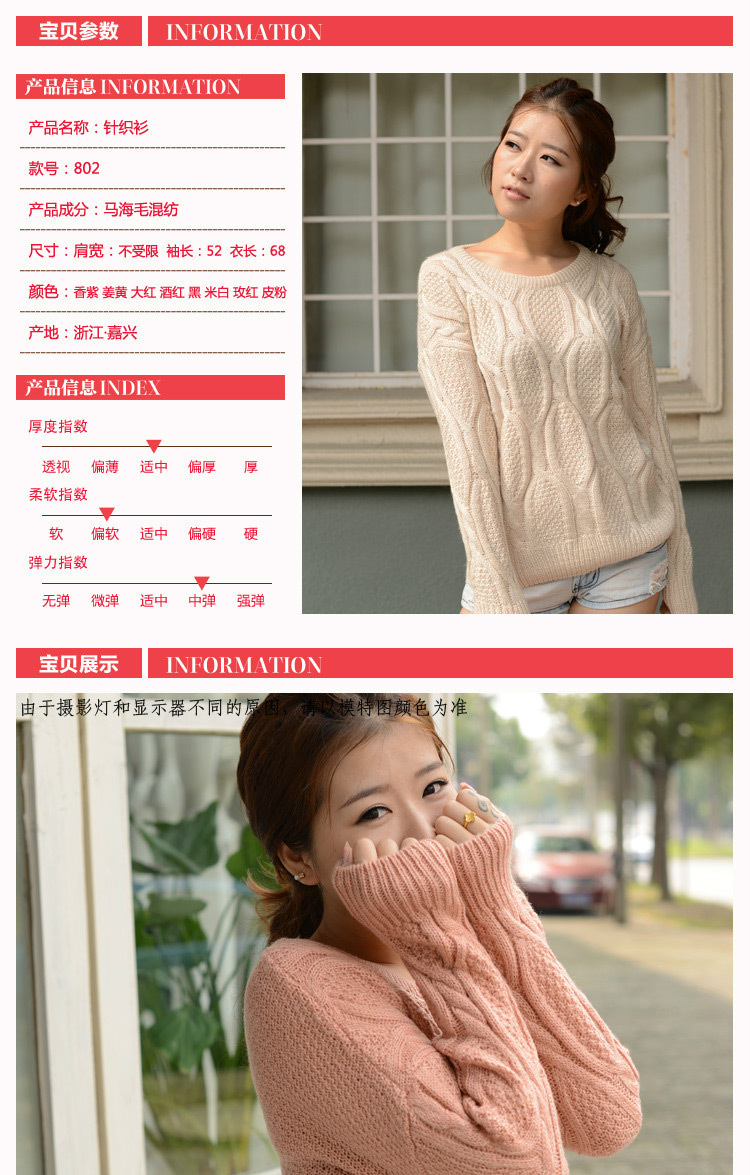 2.關於色差:商品均為實物拍攝,我們會盡量減少色差,不同的顯示器色彩和對比度都會有差異(由於工藝的原因,不同批次的毛衣也會存在色差)