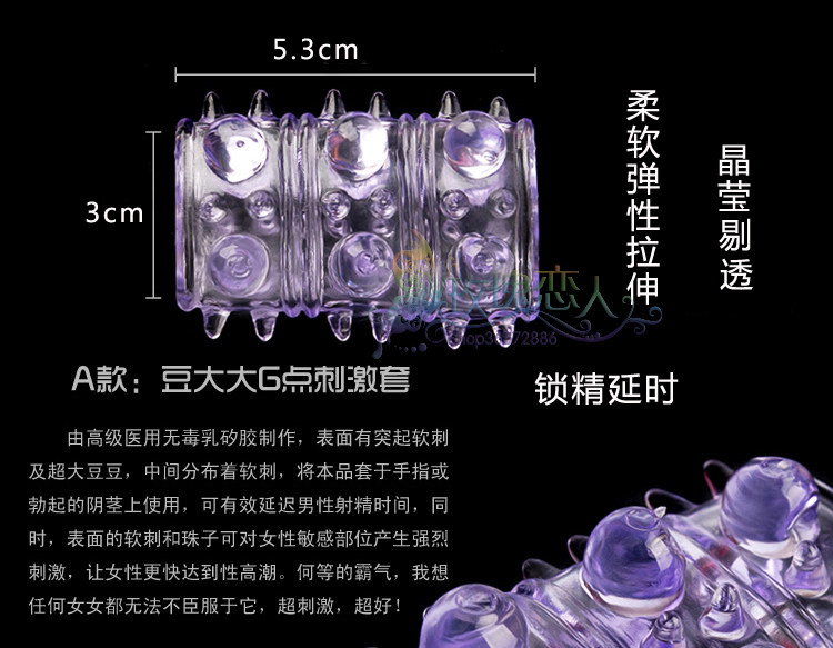 套於陰莖或手指上使用,外圈凸起彩珠(彩珠有一定硬度),充分磨擦女性陰道,給女性帶來無限快感,促進女性性高潮,和諧性。本器具使用前,用75%的醫用酒精擦洗消毒,塗抹少量潤滑劑使用更佳。