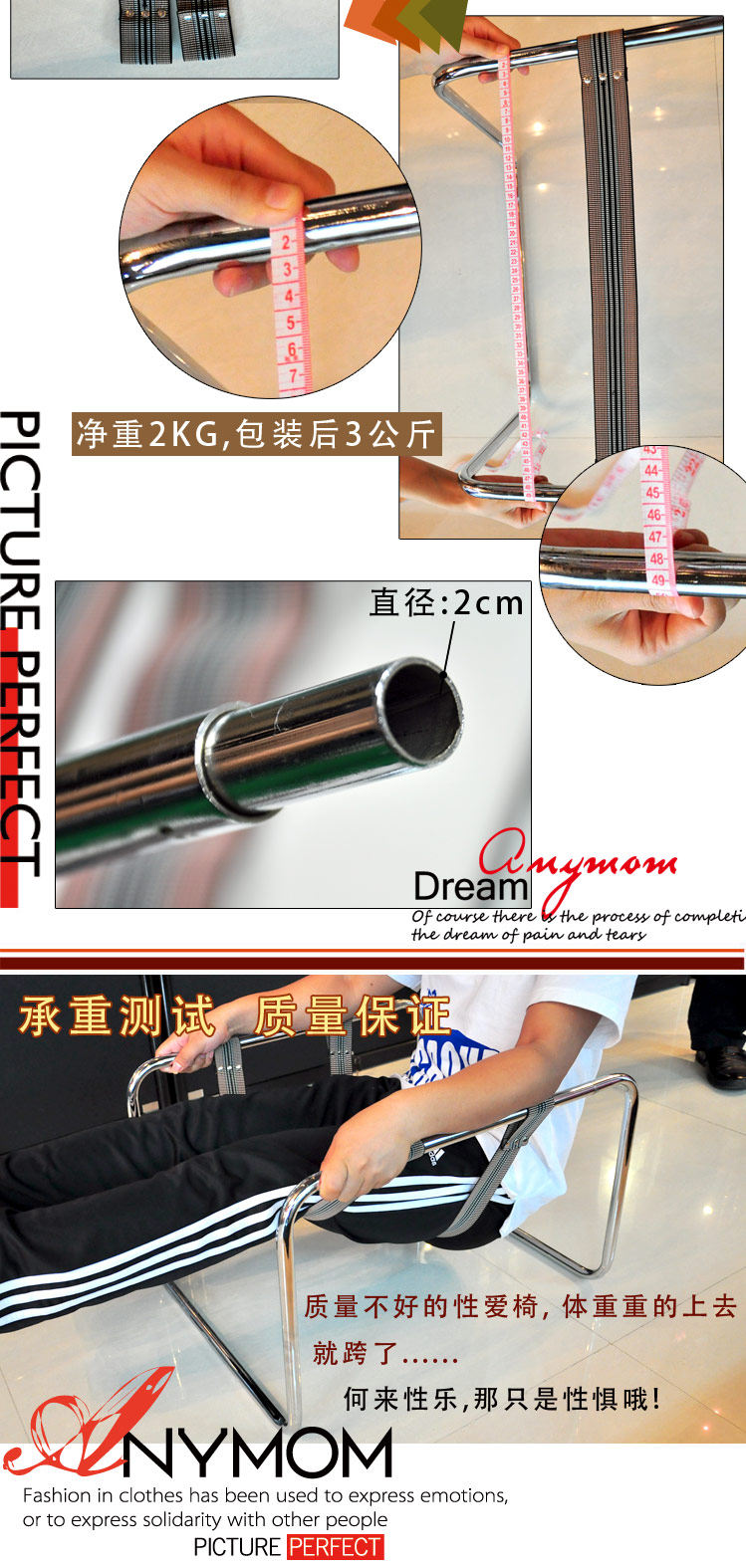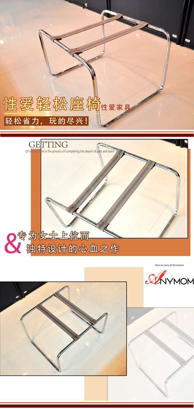 本產品又名無重力性愛椅,專為女性打造設計,是一種女性專用功能輔助器,女性跨座其上,鋼琴烤漆鋼架及兩條進口彈力帶,可承受女性的全部或大部分體重,讓整個人的動作變得非常輕盈,同時女性就象坐在椅子上舒適。利用彈性力帶,可自主調整情趣角度、深度、速度及方向做360度的微調,達到自己感覺最舒服的方式,不再需要象傳統恩愛時被男人過胖的身子壓著不舒服。