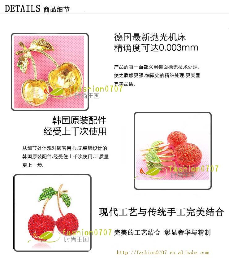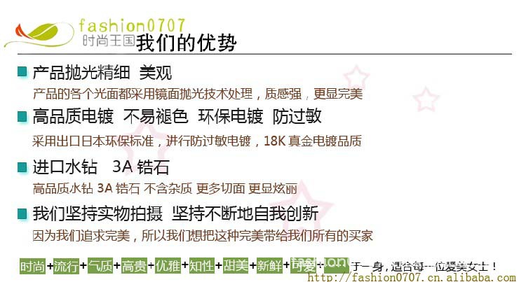 浙江省義烏市時尚0707飾品廠,座落於中國國際商貿城---浙江義烏,是經國傢相關部門批準註冊的飾品生產企業,是一傢集產品開發、設計,生產、加工,經銷批發一條龍的獨資企業。擁有經驗豐富的各類技術人員和完善的品質管理體系,嚴格按照體系執行生產.產品可通過CE,EN71,SGS,RoHS檢測 安全環保.我司產品生產工藝過程:電腦設計繪圖,模具制作,拋光,電鍍(噴油),彩繪滴膠,噴油,組合包裝等工序,每工序均有嚴格的品質檢驗. 我司產品可生產全立體,半立體,平面,縷空,半縷空等全金屬或彩繪滴膠產品,電鍍色有金 銀 鎳 白鋼 白鉻 古青銅 古紅銅.古鎳,古錫等單色或多色貨品.材質有壓克力.塑料 塑脂 皮革 水晶 錫合金 鋅合金 銅 鐵 不銹鋼等材質. 我司主要產品:韓版首飾 項鏈 毛衣鏈 手鏈 發夾 髮飾 耳環 戒指 胸針 絲巾扣 金屬工藝禮品,產品效果有平面,2D及3D等多種,電鍍色達20多種。