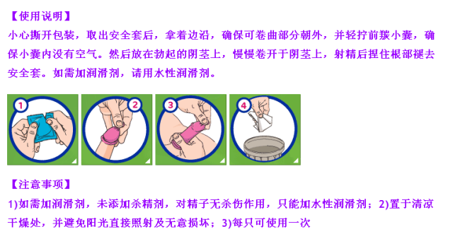 性交前戴上,射精後按住套子邊口與陰莖一起抽出,以防精液倒流。