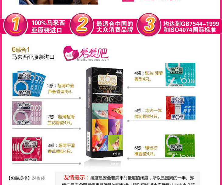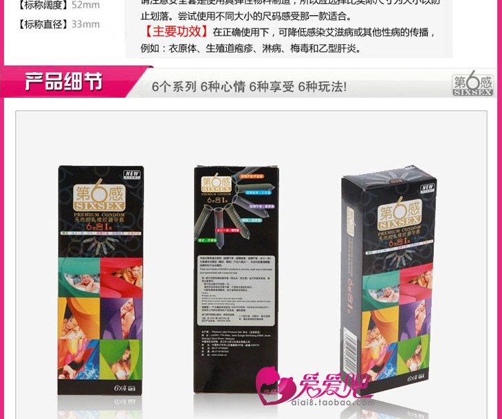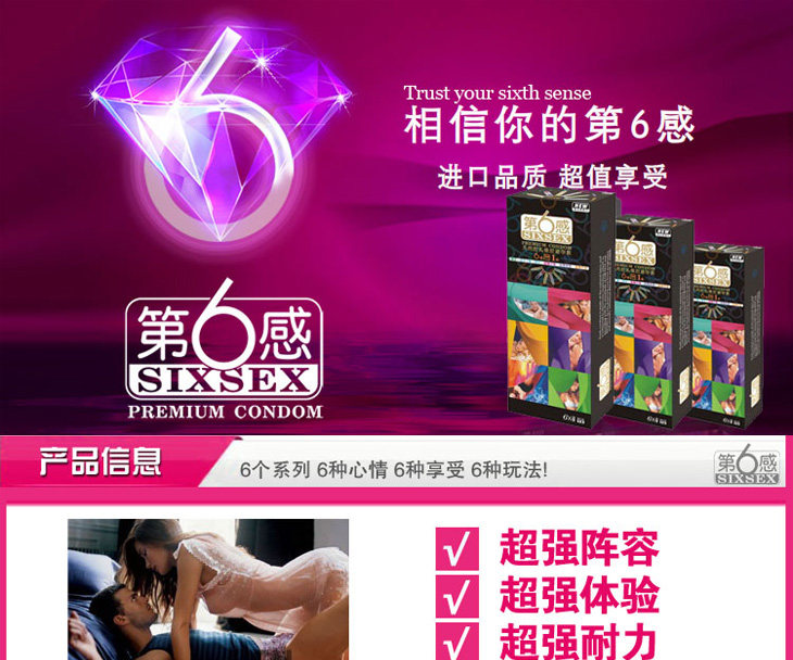 "第六感"系列安全套均由進口優質天然乳膠制成,所有產品均達到GB7544-1999和ISO4074國際標準,可有效避孕、預防艾滋病等性傳染疾病。"第六感"系列安全套因其可靠的質量和在保障生殖健康方面的有效作用,成為中國性學會唯一的安全套推薦產品。