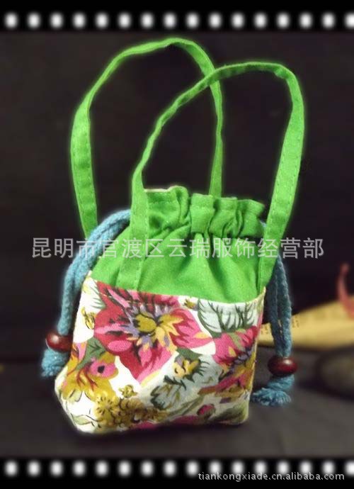 備註:開蓋方式為拉繩,是一個外袋,可裝鑰匙。顏色多樣,如訂購大量,可為您配色。手工佈藝的花佈每一款的花色都不相同,但保證款式與圖片一致。