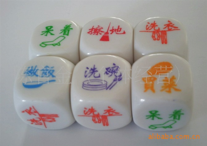 玩法:每個骰子的六面都有不同的字體,男女雙方各擲一枚骰子,一個人擲動作,一個人擲部位,待擲完後雙方可按骰子上邊的動作部位組執行即可!