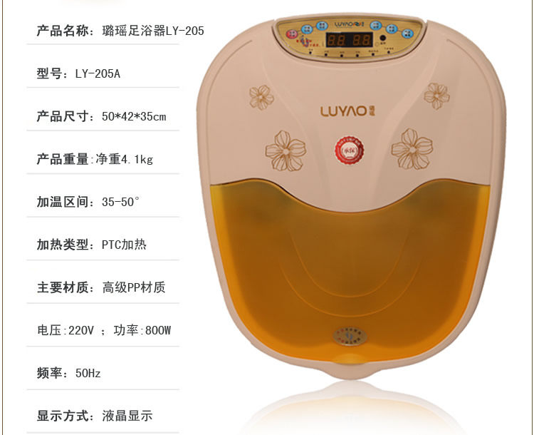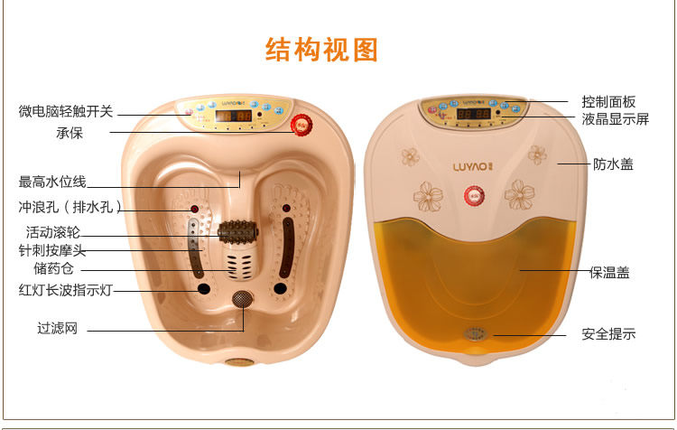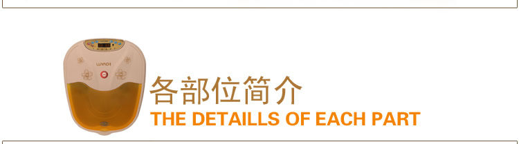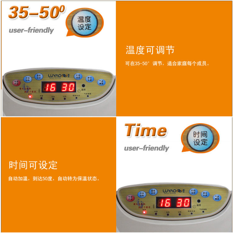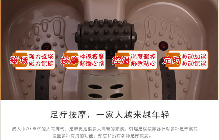 1.自動加熱保溫--足浴按摩器采用節能流水直熱式,可有效控制、保持人體感覺舒適的水溫,開機後可在35-50℃之間隨意調節,到達你設定的溫度。此機會自動保持恒溫狀態,使您盡情享受足浴按摩器帶給您的舒適。