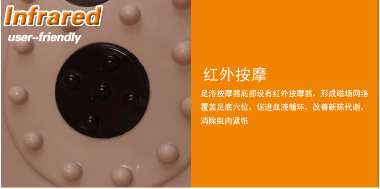 7.磁保健--足浴按摩器底部裝有永久磁石,形成低磁場網絡覆蓋足部,磁場滲透足部穴位,能產生多種效應的綜合作用,促進保健效果。