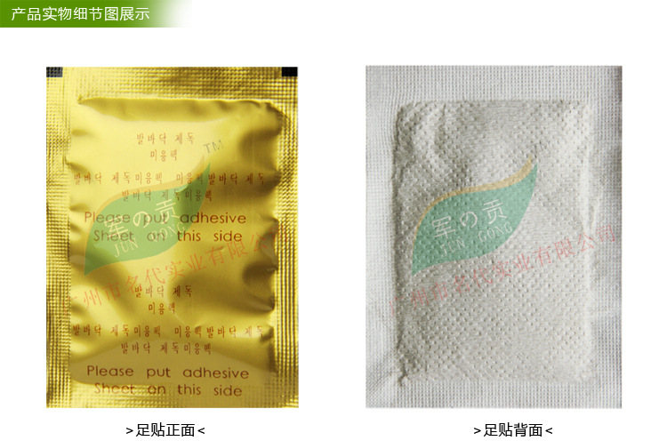 1、排毒足貼通過足底穴位將體內的濕氣、毒素從足下排出,可以舒緩緊張,改善疲勞現象,改善睡眠、皮膚及亞健康問題,不可思議的神奇效果看得見也感受得到,已經成為在韓國及日本長盛不衰的排毒美容產品,並迅速風靡香港、臺灣、新加坡和歐美國傢。它雖是藥袋貼佈的外形,卻深具中國傳統醫學中針灸、膏藥、拔罐的作用!