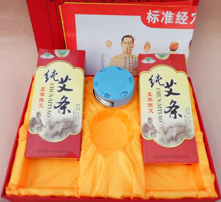內含:不銹鋼隨身灸一個,醫樂嘉五年陳艾條2盒,艾灸穴位圖一張!
