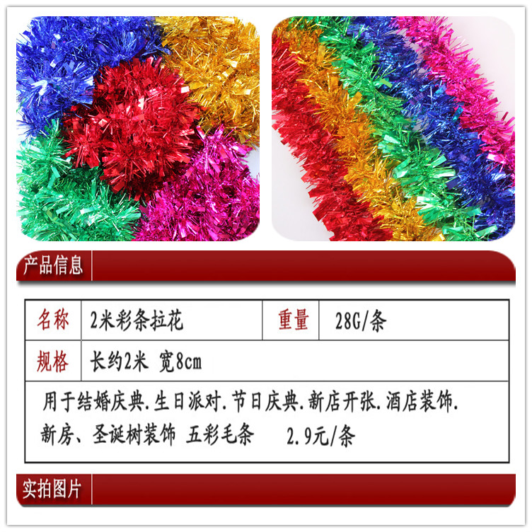 商品特色 -------------------------------------------------------- 此款非常亮麗.喜慶.漂亮。 節日結婚用品 慶典裝飾 佈置五彩毛條 拉花 彩帶彩條聖誕喜慶