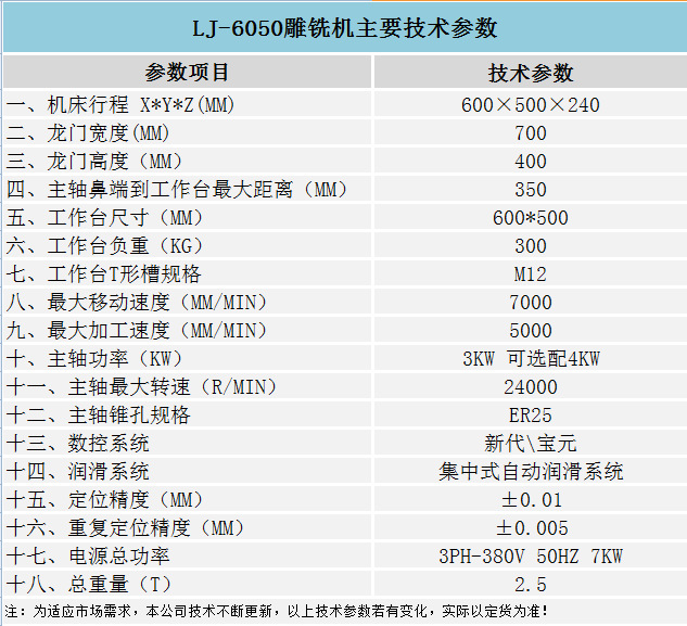 LJ-6050系列雕銑機全新改款上市,一體化鈑金設計,外形美觀,結構緊湊占地面小。操作更為人性化,整體機身采用優質鑄件,箱體結構設計,使機械長期使用變形小。采用進口絲桿導軌,加工精度高。選配8把盤式刀庫,產品加工變得更加輕松快捷。