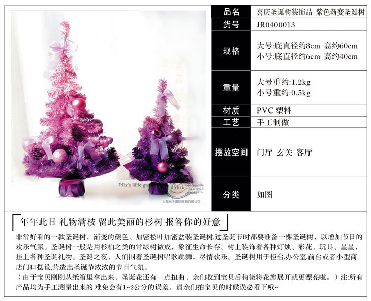 非常好看的一款聖誕樹,漸變的顏色、加密松葉加密盆裝聖誕樹,過聖誕節時都要準備一棵聖誕樹,以增加節日的歡樂氣氛。聖誕樹一般是用杉柏之類的常綠樹做成,象征生命長存。樹上裝飾著各種燈燭、彩花、玩具、星星,掛上各種聖誕禮物。聖誕之夜,人們圍著聖誕樹唱歌跳舞,盡情歡樂。聖誕樹用於櫃臺,辦公室,前臺或者小型商店門口擺設,營造出聖誕節濃濃的節日氣氛。