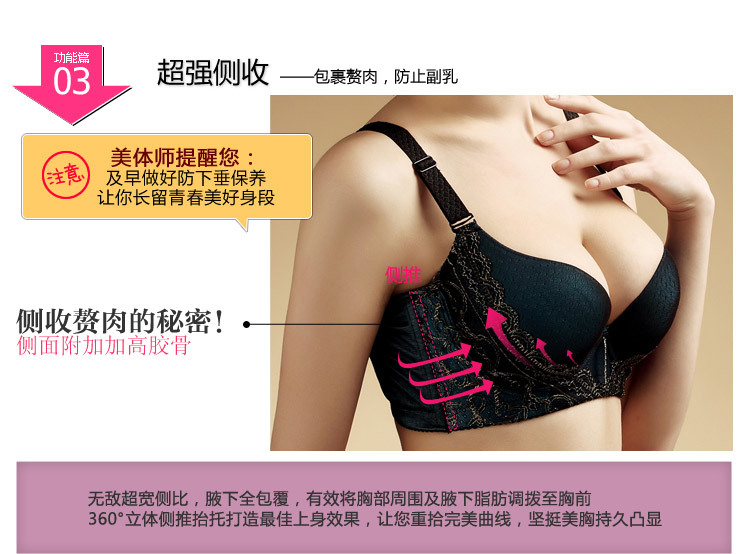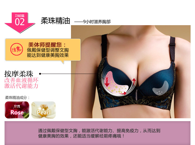 調整型內衣充分考慮到健康乳房需要空間、透氣性及正確引導脂肪生長方向所帶來的曲線美,結合人體工程學,脂肪學及穿著的舒適性,特別設計瞭獨特的矯正型內衣幫助女性收攏、托高外擴及下垂的乳房,並用高彈力提花氨綸材質,加寬背幅引導背部的脂肪回流到胸前。每一件斯媚妮產品的母版,全部采用純手工藝設計制作,每一個裁片,每一個接口都充分考慮穿著舒適性,使女性真正擁有豐滿、堅挺、健康的乳房。
