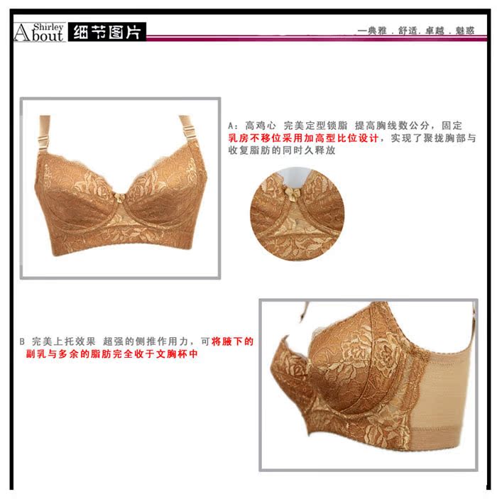 特 色:3/4立體薄杯,集中、上托效果強,罩杯外側上提加壓設計,使罩杯的聚胸效果極佳,塑造出迷人的乳溝及胸型。