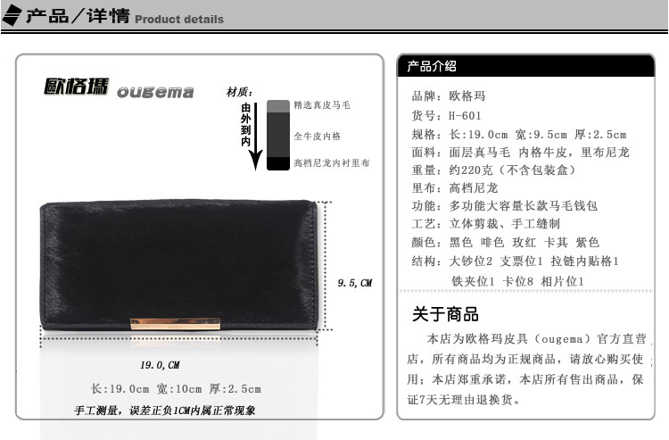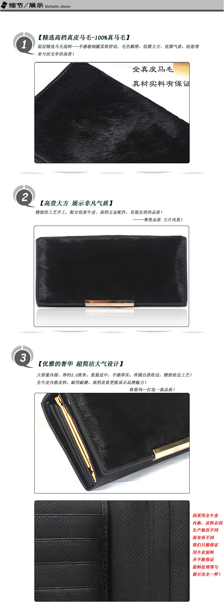 【歐格瑪皮具直銷】 此款內格全牛皮打造,馬毛也為真皮馬毛,我們選用優質馬毛真皮材料,親們勿拿市場上的低質廉價皮毛來比價!錢包皮質很柔軟,紋路清晰,盡顯高檔時尚,絕對最優惠價格.追尋流行個性的你可不能錯過~!由於自然皮毛,馬毛的長短方向等會因裁剪部位不同而有分別。(隻有人造的才有可能做到整張皮料一樣的),所以請多多諒解! |