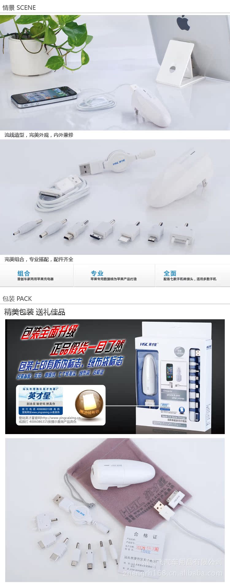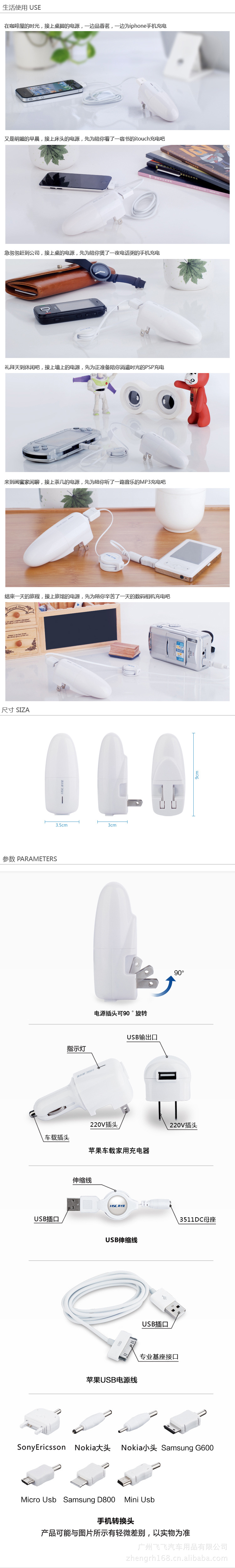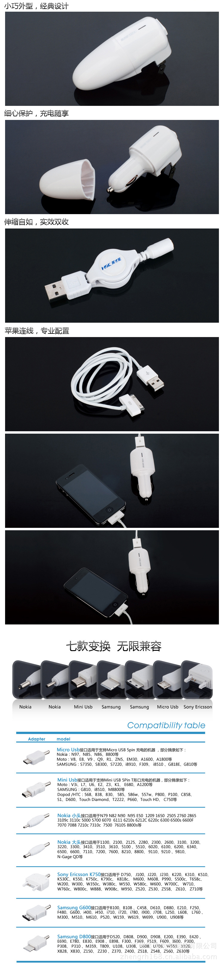 此產品包含蘋果車載傢用充電器、七款手機轉接頭、伸縮線、蘋果專用數據線。隨時隨地解決充電問題,除瞭為iphone /ipod量身打造外,可兼容大部分手機、MP3、MP4、GPS等USB設備產品
